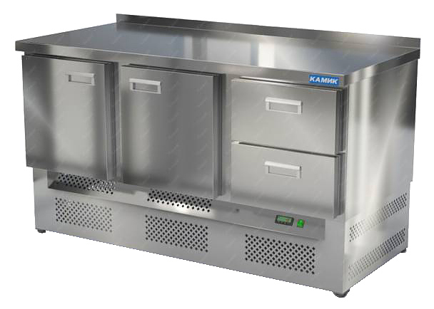 Морозильный стол КАМИК СМНБ-22157 используется на предприятиях общественного питания и торговли для заморозки и длительного хранения продуктов, полуфабрикатов и мороженого. Конструкция разделена на секции, каждая секция с дверью оснащена полкой сетчатой и парой направляющих. Корпус выполнен из нержавеющей стали AISI 430 толщиной 1 мм, столешница - из нержавеющей стали AISI 304 толщиной 1,5 мм.