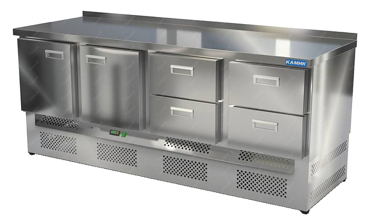Морозильный стол КАМИК СМНБ-24207 используется на предприятиях общественного питания и торговли для заморозки и длительного хранения продуктов, полуфабрикатов и мороженого. Конструкция разделена на секции, каждая секция с дверью, оснащена полкой сетчатой и парой направляющих. Корпус выполнен из нержавеющей стали AISI 430 толщиной 1 мм, столешница - из нержавеющей стали AISI 304 толщиной 1,5 мм.