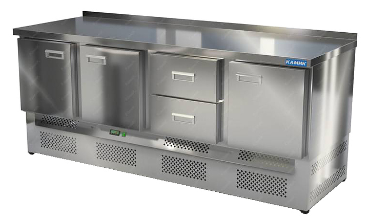 Морозильный стол КАМИК СМНБ-32206 используется на предприятиях общественного питания и торговли для заморозки и длительного хранения продуктов, полуфабрикатов и мороженого. Конструкция разделена на секции, каждая секция с дверью оснащена полкой сетчатой и парой направляющих. Корпус выполнен из нержавеющей стали AISI 430 толщиной 1 мм, столешница - из нержавеющей стали AISI 304 толщиной 1,5 мм.