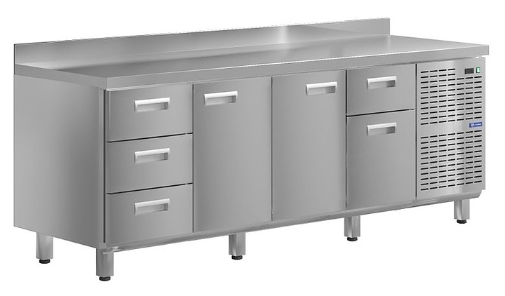 Морозильный стол KAYMAN KСМ-3114/70 предназначен для охлаждения, хранения и обработки пищевых продуктов в ресторанах, барах, кафе, столовых, на профессиональных кухнях и пищевых производствах. На прочной столешнице можно резать, раскатывать и отбивать полуфабрикаты. Модель оснащена 5 ящиками и 2 дверьми. Изделие выполнено из высококачественной нержавеющей стали, отличающейся прочностью и долговечностью.