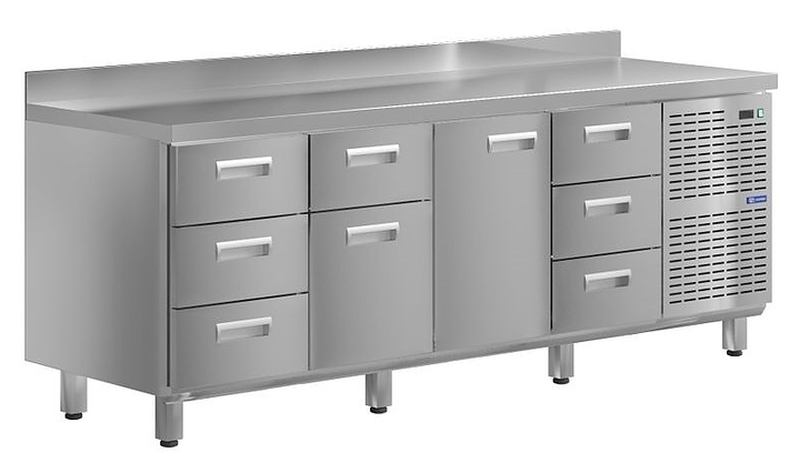 Морозильный стол KAYMAN KСМ-3413/70 предназначен для охлаждения, хранения и обработки пищевых продуктов в ресторанах, барах, кафе, столовых, на профессиональных кухнях и пищевых производствах. На прочной столешнице можно резать, раскатывать и отбивать полуфабрикаты. Модель оснащена 8 ящиками и 1 дверью. Изделие выполнено из высококачественной нержавеющей стали, отличающейся прочностью и долговечностью.