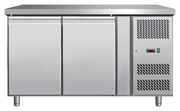 Морозильный стол Koreco GN/2100BT предназначен для обработки ингридиентов и кратковременного и длительного хранения предварительно замороженных пищевых продуктов на предприятиях общественного питания и торговли. Модель оснащена расположенным справа встроенным холодильным агрегатом, 3 холодильными секциями с распашными дверьми и электронным блоком управления. Корпус выполнен из высококачественной нержавеющей стали марки AISI201, полки – из металла с полимерным покрытием.