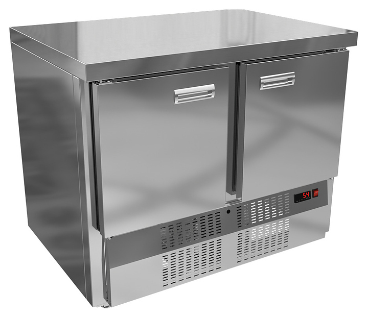 Морозильный стол KRONER СМ 2-100-70 предназначен для хранения предварительно замороженных пищевых продуктов и обработки ингредиентов в процессе приготовления блюд. Модель оснащена встроенным компрессорным холодильным агрегатом с нижним расположением, столешницей без борта, электронной панелью управления и морозильной камерой с 2 секциями с распашными дверьми. Корпус и столешница выполнены из шлифованной нержавеющей стали, задняя стенка – из оцинкованной стали.