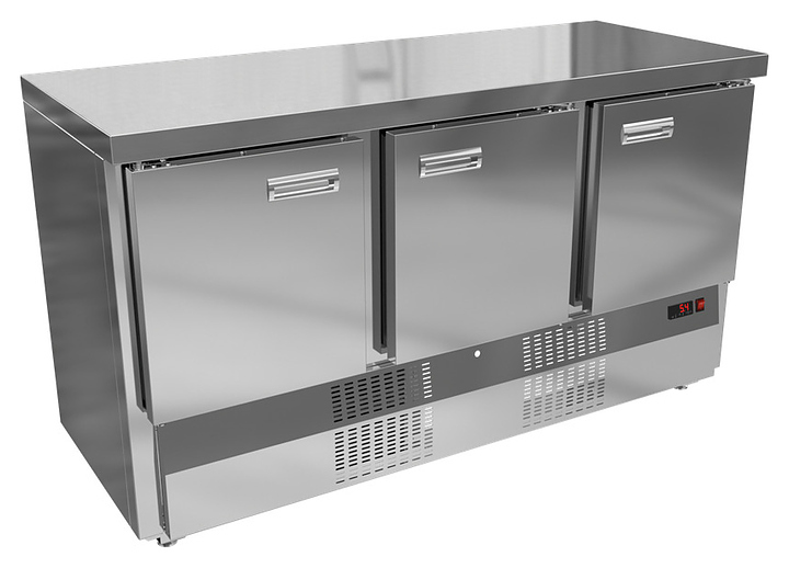 Морозильный стол KRONER СМ 3-150-70 предназначен для хранения предварительно замороженных пищевых продуктов и обработки ингредиентов в процессе приготовления блюд. Модель оснащена встроенным компрессорным холодильным агрегатом с нижним расположением, столешницей без борта, электронной панелью управления и морозильной камерой с 3 секциями с распашными дверьми. Корпус и столешница выполнены из шлифованной нержавеющей стали, задняя стенка – из оцинкованной стали.