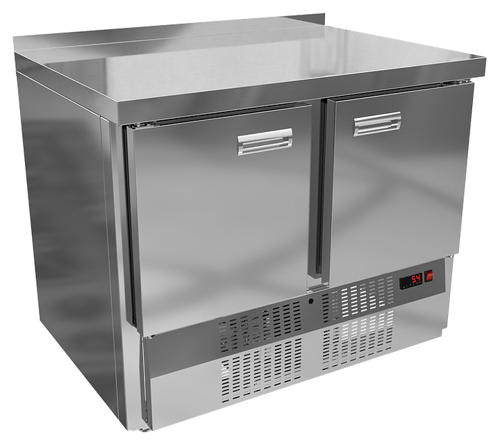 Морозильный стол KRONER СМб 2-100-70 предназначен для хранения предварительно замороженных пищевых продуктов и обработки ингредиентов в процессе приготовления блюд. Модель оснащена встроенным компрессорным холодильным агрегатом с нижним расположением, столешницей c задним бортом, электронной панелью управления и морозильной камерой с 2 секциями с распашными дверьми. Корпус и столешница выполнены из шлифованной нержавеющей стали, задняя стенка – из оцинкованной стали.
