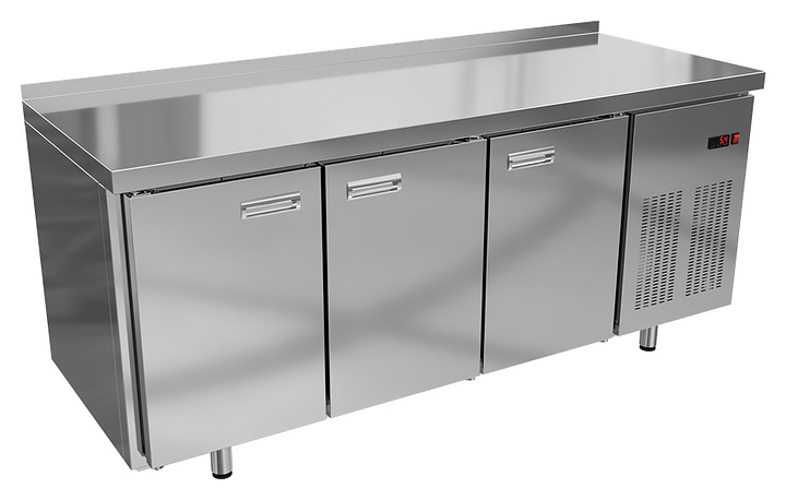 Морозильный стол KRONER СМб 3-180-70 предназначен для хранения предварительно замороженных пищевых продуктов и обработки ингредиентов в процессе приготовления блюд. Модель оснащена встроенным компрессорным холодильным агрегатом с боковым расположением, столешницей c задним бортом, электронной панелью управления и морозильной камерой с 3 секциями с распашными дверьми. Корпус и столешница выполнены из шлифованной нержавеющей стали, задняя стенка – из оцинкованной стали.
