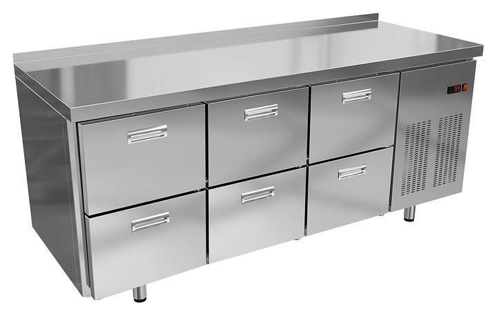 Морозильный стол KRONER СМб 6я-180-70 предназначен для хранения предварительно замороженных пищевых продуктов и обработки ингредиентов в процессе приготовления блюд. Модель оснащена встроенным компрессорным холодильным агрегатом с боковым расположением, столешницей c задним бортом, электронной панелью управления и морозильной камерой с 3 секциями: в каждой секции по 2 выдвижных ящика. Корпус и столешница выполнены из шлифованной нержавеющей стали, задняя стенка – из оцинкованной стали.