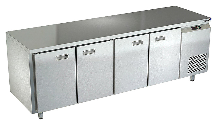 Морозильный стол Техно-ТТ СПБ/М-121/40-2206 предназначен для раскатки теста, обработки, заморозки и долговременного хранения продуктов, полуфабрикатов, напитков и мороженого на предприятиях общественного питания и торговли. Модель оснащена 4 секциями с 4 дверьми и регулируемой полкой-решеткой, петлями-доводчиками (Польша) и круглыми ножками, регулируемыми по высоте на 50 мм (Италия). Корпус и столешница выполнены из нержавеющей стали AISI 430, задняя стенка и дно - из оцинкованной стали.
