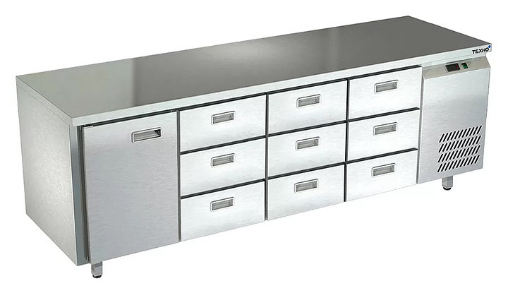Морозильный стол Техно-ТТ СПБ/М-122/19-2207 предназначен для раскатки теста, обработки, заморозки и долговременного хранения продуктов, полуфабрикатов, напитков и мороженого на предприятиях общественного питания и торговли. Модель оснащена 1 секцией с дверью и регулируемой полкой-решеткой, 3 секциями с 9 ящиками, направляющими с доводчиками (Австрия), петлями-доводчиками (Польша) и круглыми ножками, регулируемыми по высоте на 50 мм (Италия). Корпус и столешница выполнены из нержавеющей стали AISI 430, задняя стенка и дно - из оцинкованной стали.