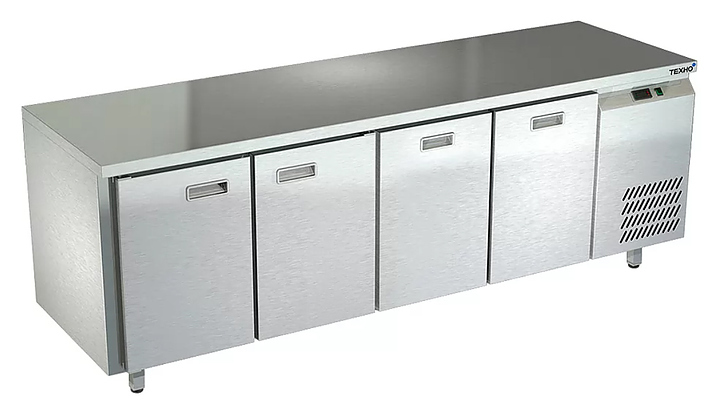 Морозильный стол Техно-ТТ СПБ/М-122/22-2207 предназначен для раскатки теста, обработки, заморозки и долговременного хранения продуктов, полуфабрикатов, напитков и мороженого на предприятиях общественного питания и торговли. Модель оснащена 2 секциями с 2 дверьми и регулируемой полкой-решеткой, 2 секциями с 2 ящиками, направляющими с доводчиками (Австрия), петлями-доводчиками (Польша) и круглыми ножками, регулируемыми по высоте на 50 мм (Италия). Корпус и столешница выполнены из нержавеющей стали AISI 430, задняя стенка и дно - из оцинкованной стали.