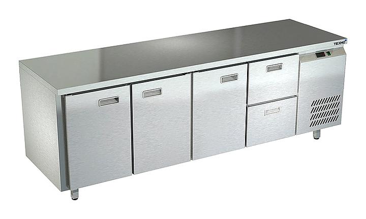 Морозильный стол Техно-ТТ СПБ/М-122/32-2207 предназначен для раскатки теста, обработки, заморозки и долговременного хранения продуктов, полуфабрикатов, напитков и мороженого на предприятиях общественного питания и торговли. Модель оснащена 3 секциями с 3 дверьми и регулируемой полкой-решеткой, 1 секцией с 2 ящиками, направляющими с доводчиками (Австрия), петлями-доводчиками (Польша) и круглыми ножками, регулируемыми по высоте на 50 мм (Италия). Корпус и столешница выполнены из нержавеющей стали AISI 430, задняя стенка и дно - из оцинкованной стали.