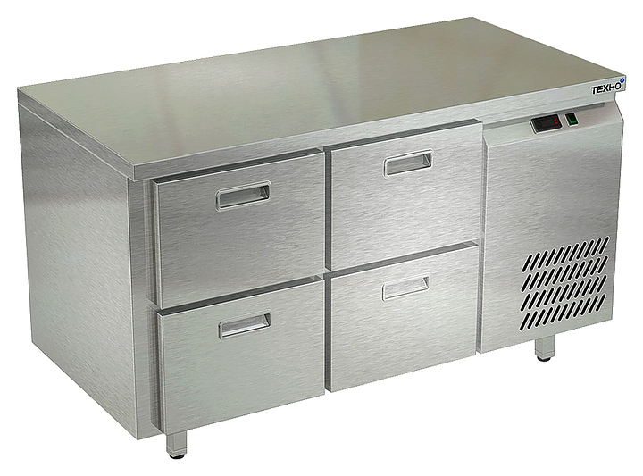 Морозильный стол Техно-ТТ СПБ/М-123/04-1306 предназначен для раскатки теста, обработки, заморозки и долговременного хранения продуктов, полуфабрикатов, напитков и мороженого на предприятиях общественного питания и торговли. Модель оснащена 2 секциями с 4 ящиками, направляющими с доводчиками (Австрия) и круглыми ножками, регулируемыми по высоте на 50 мм (Италия). Корпус и столешница выполнены из нержавеющей стали AISI 430, задняя стенка и дно - из оцинкованной стали.