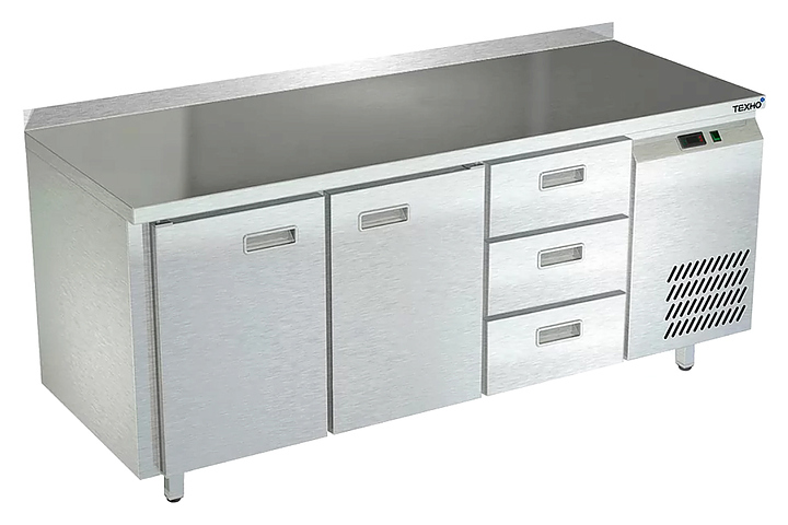 Морозильный стол Техно-ТТ СПБ/М-222/23-1806 предназначен для раскатки теста, обработки, заморозки и долговременного хранения продуктов, полуфабрикатов, напитков и мороженого на предприятиях общественного питания и торговли. Модель оснащена 2 секциями с 2 дверьми и регулируемой полкой-решеткой, 1 секцией с 3 ящиками, направляющими с доводчиками (Австрия), петлями-доводчиками (Польша), бортом и круглыми ножками, регулируемыми по высоте на 50 мм (Италия). Корпус и столешница выполнены из нержавеющей стали AISI 430, задняя стенка и дно - из оцинкованной стали.