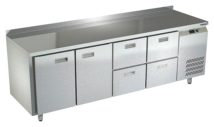 Морозильный стол Техно-ТТ СПБ/М-222/24-2207 предназначен для раскатки теста, обработки, заморозки и долговременного хранения продуктов, полуфабрикатов, напитков и мороженого на предприятиях общественного питания и торговли. Модель оснащена 2 секциями с 2 дверьми и регулируемой полкой-решеткой, 2 секциями с 4 ящиками, направляющими с доводчиками (Австрия), петлями-доводчиками (Польша), бортом и круглыми ножками, регулируемыми по высоте на 50 мм (Италия). Корпус и столешница выполнены из нержавеющей стали AISI 430, задняя стенка и дно - из оцинкованной стали.