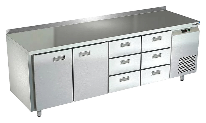 Морозильный стол Техно-ТТ СПБ/М-222/26-2207 предназначен для раскатки теста, обработки, заморозки и долговременного хранения продуктов, полуфабрикатов, напитков и мороженого на предприятиях общественного питания и торговли. Модель оснащена 2 секциями с 2 дверьми и регулируемой полкой-решеткой, 2 секциями с 6 ящиками, направляющими с доводчиками (Австрия), петлями-доводчиками (Польша), бортом и круглыми ножками, регулируемыми по высоте на 50 мм (Италия). Корпус и столешница выполнены из нержавеющей стали AISI 430, задняя стенка и дно - из оцинкованной стали.
