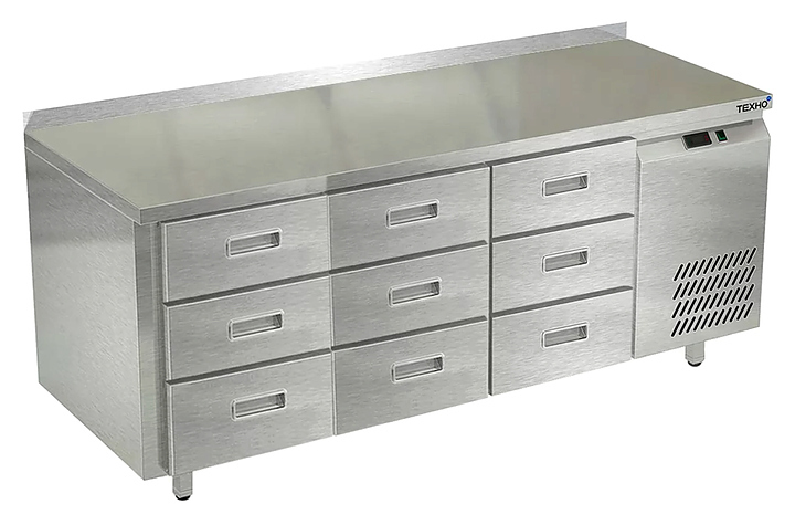 Морозильный стол Техно-ТТ СПБ/М-223/09-1807 предназначен для раскатки теста, обработки, заморозки и долговременного хранения продуктов, полуфабрикатов, напитков и мороженого на предприятиях общественного питания и торговли. Модель оснащена 3 секциями с 9 ящиками, направляющими с доводчиками (Австрия), бортом и круглыми ножками, регулируемыми по высоте на 50 мм (Италия). Корпус и столешница выполнены из нержавеющей стали AISI 430, задняя стенка и дно - из оцинкованной стали.