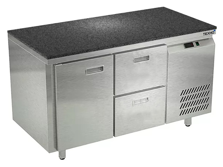 Морозильный стол Техно-ТТ СПБ/М-322/12-1307 предназначен для раскатки теста, обработки, заморозки и долговременного хранения продуктов, полуфабрикатов, напитков и мороженого на предприятиях общественного питания и торговли. Модель оснащена 1 секцией с дверью и регулируемой полкой-решеткой, 1 секцией с 2 ящиками, направляющими с доводчиками (Австрия), петлями-доводчиками (Польша) и круглыми ножками, регулируемыми по высоте на 50 мм (Италия). Корпус выполнен из нержавеющей стали AISI 430, задняя стенка и дно - из оцинкованной стали, столешница - из камня.