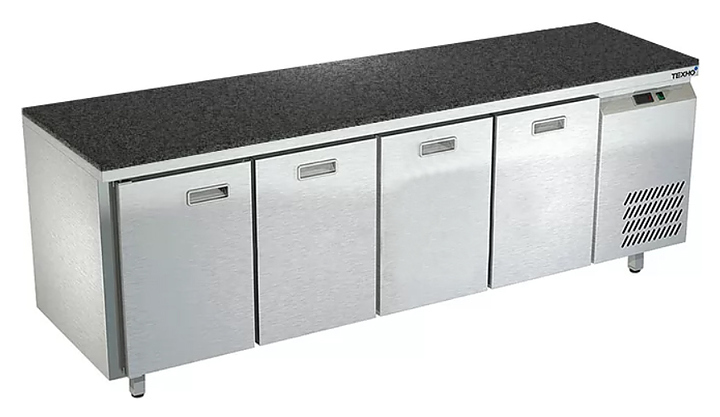 Морозильный стол Техно-ТТ СПБ/М-322/13-2206 предназначен для раскатки теста, обработки, заморозки и долговременного хранения продуктов, полуфабрикатов, напитков и мороженого на предприятиях общественного питания и торговли. Модель оснащена 1 секцией с дверью и регулируемой полкой-решеткой, 3 секциями с 3 ящиками, направляющими с доводчиками (Австрия), петлями-доводчиками (Польша) и круглыми ножками, регулируемыми по высоте на 50 мм (Италия). Корпус выполнен из нержавеющей стали AISI 430, задняя стенка и дно - из оцинкованной стали, столешница - из камня.