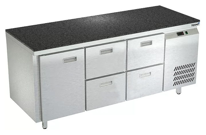 Морозильный стол Техно-ТТ СПБ/М-322/14-1807 предназначен для раскатки теста, обработки, заморозки и долговременного хранения продуктов, полуфабрикатов, напитков и мороженого на предприятиях общественного питания и торговли. Модель оснащена 1 секцией с дверью и регулируемой полкой-решеткой, 2 секциями с 4 ящиками, направляющими с доводчиками (Австрия), петлями-доводчиками (Польша) и круглыми ножками, регулируемыми по высоте на 50 мм (Италия). Корпус выполнен из нержавеющей стали AISI 430, задняя стенка и дно - из оцинкованной стали, столешница - из камня.