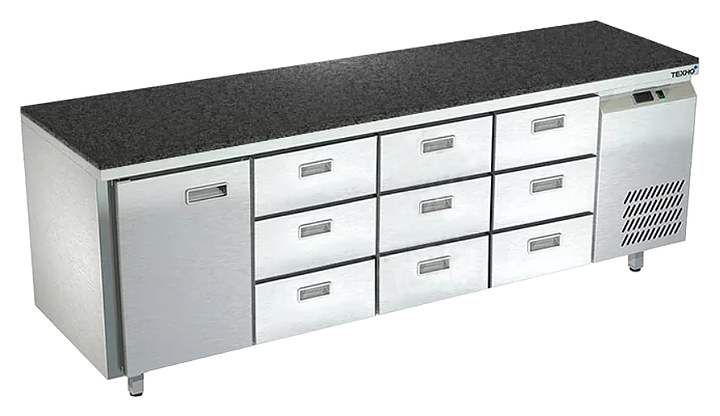 Морозильный стол Техно-ТТ СПБ/М-322/19-2206 предназначен для раскатки теста, обработки, заморозки и долговременного хранения продуктов, полуфабрикатов, напитков и мороженого на предприятиях общественного питания и торговли. Модель оснащена 1 секцией с дверью и регулируемой полкой-решеткой, 3 секциями с 9 ящиками, направляющими с доводчиками (Австрия), петлями-доводчиками (Польша) и круглыми ножками, регулируемыми по высоте на 50 мм (Италия). Корпус выполнен из нержавеющей стали AISI 430, задняя стенка и дно - из оцинкованной стали, столешница - из камня.