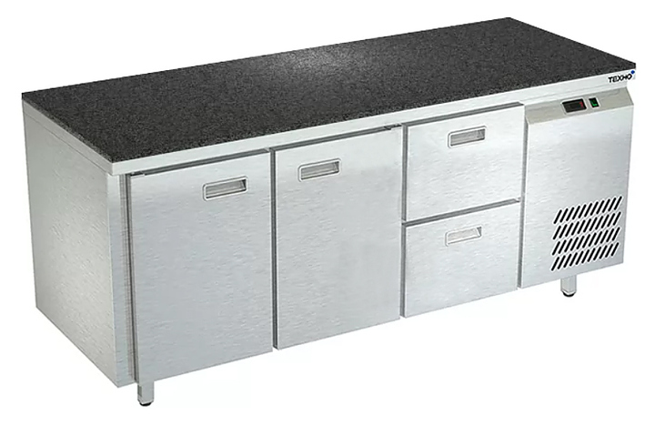 Морозильный стол Техно-ТТ СПБ/М-322/22-1807 предназначен для раскатки теста, обработки, заморозки и долговременного хранения продуктов, полуфабрикатов, напитков и мороженого на предприятиях общественного питания и торговли. Модель оснащена 2 секциями с 2 дверьми и регулируемой полкой-решеткой, 1 секцией с 2 ящиками, направляющими с доводчиками (Австрия), петлями-доводчиками (Польша) и круглыми ножками, регулируемыми по высоте на 50 мм (Италия). Корпус выполнен из нержавеющей стали AISI 430, задняя стенка и дно - из оцинкованной стали, столешница - из камня.