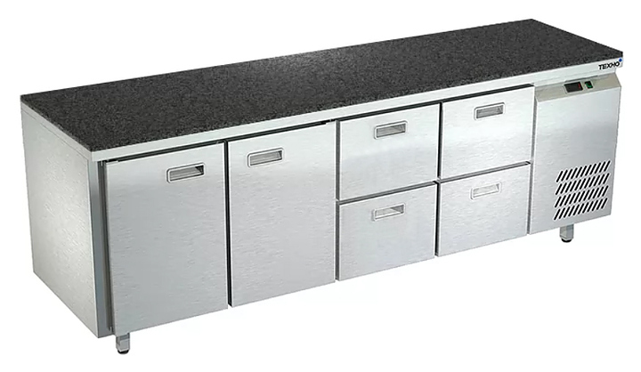Морозильный стол Техно-ТТ СПБ/М-322/24-2207 предназначен для раскатки теста, обработки, заморозки и долговременного хранения продуктов, полуфабрикатов, напитков и мороженого на предприятиях общественного питания и торговли. Модель оснащена 2 секциями с 2 дверьми и регулируемой полкой-решеткой, 2 секциями с 4 ящиками, направляющими с доводчиками (Австрия), петлями-доводчиками (Польша) и круглыми ножками, регулируемыми по высоте на 50 мм (Италия). Корпус выполнен из нержавеющей стали AISI 430, задняя стенка и дно - из оцинкованной стали, столешница - из камня.