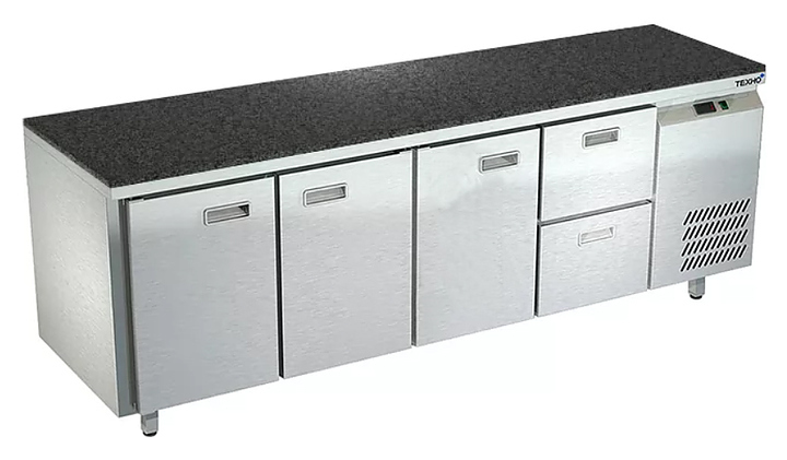 Морозильный стол Техно-ТТ СПБ/М-322/32-2206 предназначен для раскатки теста, обработки, заморозки и долговременного хранения продуктов, полуфабрикатов, напитков и мороженого на предприятиях общественного питания и торговли. Модель оснащена 3 секциями с 3 дверями и регулируемой полкой-решеткой, 1 секцией с 2 ящиками, направляющими с доводчиками (Австрия), петлями-доводчиками (Польша) и круглыми ножками, регулируемыми по высоте на 50 мм (Италия). Корпус выполнен из нержавеющей стали AISI 430, задняя стенка и дно - из оцинкованной стали, столешница - из камня.