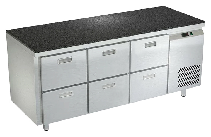 Морозильный стол Техно-ТТ СПБ/М-323/06-1806 предназначен для раскатки теста, обработки, заморозки и долговременного хранения продуктов, полуфабрикатов, напитков и мороженого на предприятиях общественного питания и торговли. Модель оснащена 3 секциями с 6 ящиками, направляющими с доводчиками (Австрия) и круглыми ножками, регулируемыми по высоте на 50 мм (Италия). Корпус выполнен из нержавеющей стали AISI 430, задняя стенка и дно - из оцинкованной стали, столешница - из камня.