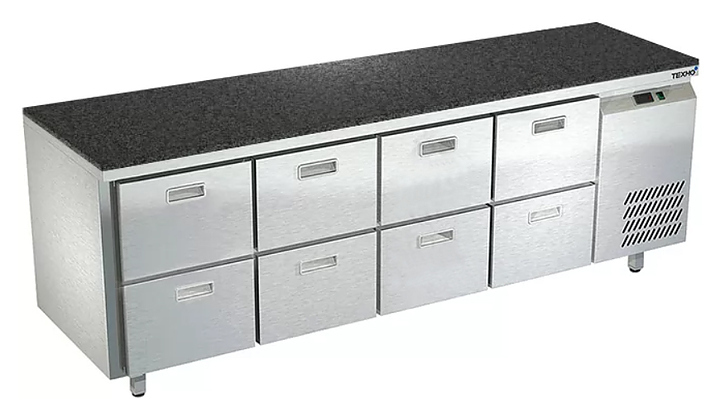 Морозильный стол Техно-ТТ СПБ/М-323/08-2207 предназначен для раскатки теста, обработки, заморозки и долговременного хранения продуктов, полуфабрикатов, напитков и мороженого на предприятиях общественного питания и торговли. Модель оснащена 4 секциями с 8 ящиками, направляющими с доводчиками (Австрия) и круглыми ножками, регулируемыми по высоте на 50 мм (Италия). Корпус выполнен из нержавеющей стали AISI 430, задняя стенка и дно - из оцинкованной стали, столешница - из камня.