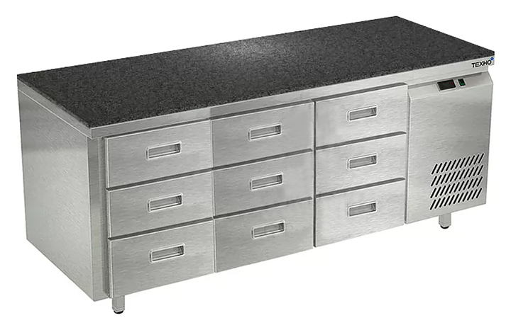 Морозильный стол Техно-ТТ СПБ/М-323/09-1806 предназначен для раскатки теста, обработки, заморозки и долговременного хранения продуктов, полуфабрикатов, напитков и мороженого на предприятиях общественного питания и торговли. Модель оснащена 3 секциями с 9 ящиками, направляющими с доводчиками (Австрия) и круглыми ножками, регулируемыми по высоте на 50 мм (Италия). Корпус выполнен из нержавеющей стали AISI 430, задняя стенка и дно - из оцинкованной стали, столешница - из камня.