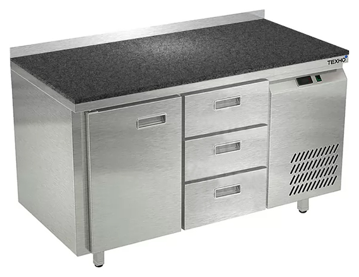 Морозильный стол Техно-ТТ СПБ/М-422/13-1307 предназначен для раскатки теста, обработки, заморозки и долговременного хранения продуктов, полуфабрикатов, напитков и мороженого на предприятиях общественного питания и торговли. Модель оснащена 1 секцией с дверью и регулируемой полкой, 1 секцией с 3 ящиками, направляющими с доводчиками (Австрия), петлями-доводчиками (Польша), бортом и круглыми ножками, регулируемыми по высоте на 50 мм (Италия). Корпус выполнен из нержавеющей стали AISI 430, задняя стенка и дно - из оцинкованной стали, столешница - из камня.