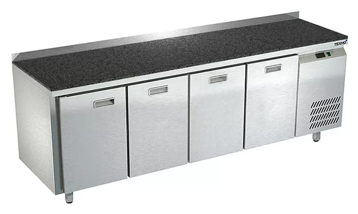 Морозильный стол Техно-ТТ СПБ/М-422/13-2207 предназначен для раскатки теста, обработки, заморозки и долговременного хранения продуктов, полуфабрикатов, напитков и мороженого на предприятиях общественного питания и торговли. Модель оснащена 1 секцией с дверью и регулируемой полкой-решеткой, 3 секциями с 3 ящиками, направляющими с доводчиками (Австрия), петлями-доводчиками (Польша), бортом и круглыми ножками, регулируемыми по высоте на 50 мм (Италия). Корпус выполнен из нержавеющей стали AISI 430, задняя стенка и дно - из оцинкованной стали, столешница - из камня.