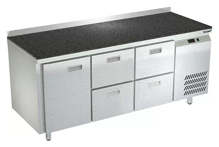 Морозильный стол Техно-ТТ СПБ/М-422/14-1807 предназначен для раскатки теста, обработки, заморозки и долговременного хранения продуктов, полуфабрикатов, напитков и мороженого на предприятиях общественного питания и торговли. Модель оснащена 1 секцией с дверью и регулируемой полкой-решеткой, 2 секциями с 4 ящиками, направляющими с доводчиками (Австрия), петлями-доводчиками (Польша), бортом и круглыми ножками, регулируемыми по высоте на 50 мм (Италия). Корпус выполнен из нержавеющей стали AISI 430, задняя стенка и дно - из оцинкованной стали, столешница - из камня.