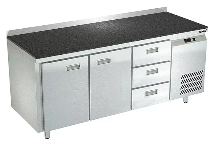 Морозильный стол Техно-ТТ СПБ/М-422/23-1806 предназначен для раскатки теста, обработки, заморозки и долговременного хранения продуктов, полуфабрикатов, напитков и мороженого на предприятиях общественного питания и торговли. Модель оснащена 2 секциями с 2 дверьми и регулируемой полкой-решеткой, 1 секцией с 3 ящиками, направляющими с доводчиками (Австрия), петлями-доводчиками (Польша), бортом и круглыми ножками, регулируемыми по высоте на 50 мм (Италия). Корпус выполнен из нержавеющей стали AISI 430, задняя стенка и дно - из оцинкованной стали, столешница - из камня.
