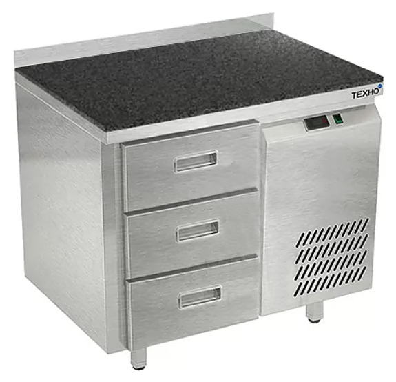 Морозильный стол Техно-ТТ СПБ/М-423/03-906 предназначен для раскатки теста, обработки, заморозки и долговременного хранения продуктов, полуфабрикатов, напитков и мороженого на предприятиях общественного питания и торговли. Модель оснащена 1 секцией с 3 ящиками, направляющими с доводчиками (Австрия), бортом и круглыми ножками, регулируемыми по высоте на 50 мм (Италия). Корпус выполнен из нержавеющей стали AISI 430, задняя стенка и дно - из оцинкованной стали, столешница - из камня.