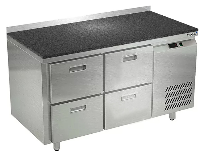 Морозильный стол Техно-ТТ СПБ/М-423/04-1306 предназначен для раскатки теста, обработки, заморозки и долговременного хранения продуктов, полуфабрикатов, напитков и мороженого на предприятиях общественного питания и торговли. Модель оснащена 2 секциями с 4 ящиками, направляющими с доводчиками (Австрия), бортом и круглыми ножками, регулируемыми по высоте на 50 мм (Италия). Корпус выполнен из нержавеющей стали AISI 430, задняя стенка и дно - из оцинкованной стали, столешница - из камня.