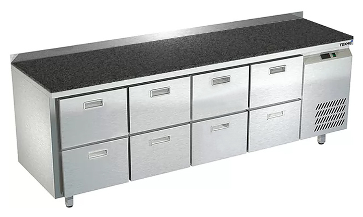 Морозильный стол Техно-ТТ СПБ/М-423/08-2206 предназначен для раскатки теста, обработки, заморозки и долговременного хранения продуктов, полуфабрикатов, напитков и мороженого на предприятиях общественного питания и торговли. Модель оснащена 4 секциями с 8 ящиками, направляющими с доводчиками (Австрия), бортом и круглыми ножками, регулируемыми по высоте на 50 мм (Италия). Корпус выполнен из нержавеющей стали AISI 430, задняя стенка и дно - из оцинкованной стали, столешница - из камня.