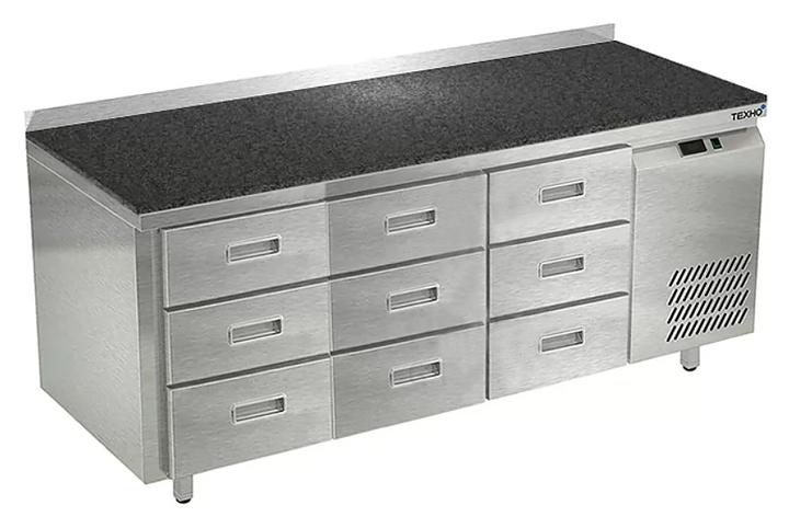 Морозильный стол Техно-ТТ СПБ/М-423/09-1806 предназначен для раскатки теста, обработки, заморозки и долговременного хранения продуктов, полуфабрикатов, напитков и мороженого на предприятиях общественного питания и торговли. Модель оснащена 3 секциями с 9 ящиками, направляющими с доводчиками (Австрия), бортом и круглыми ножками, регулируемыми по высоте на 50 мм (Италия). Корпус выполнен из нержавеющей стали AISI 430, задняя стенка и дно - из оцинкованной стали, столешница - из камня.