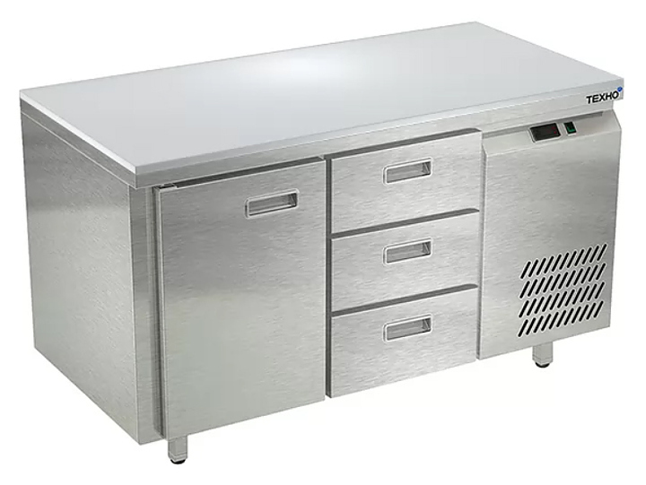 Морозильный стол Техно-ТТ СПБ/М-522/13-1306 предназначен для раскатки теста, обработки, заморозки и долговременного хранения продуктов, полуфабрикатов, напитков и мороженого на предприятиях общественного питания и торговли. Модель оснащена 1 секцией с дверью и регулируемой полкой-решеткой, 1 секцией с 3 ящиками, направляющими с доводчиками (Австрия), петлями-доводчиками (Польша) и круглыми ножками, регулируемыми по высоте на 50 мм (Италия). Корпус выполнен из нержавеющей стали AISI 430, задняя стенка и дно - из оцинкованной стали, столешница - из полипропилена.