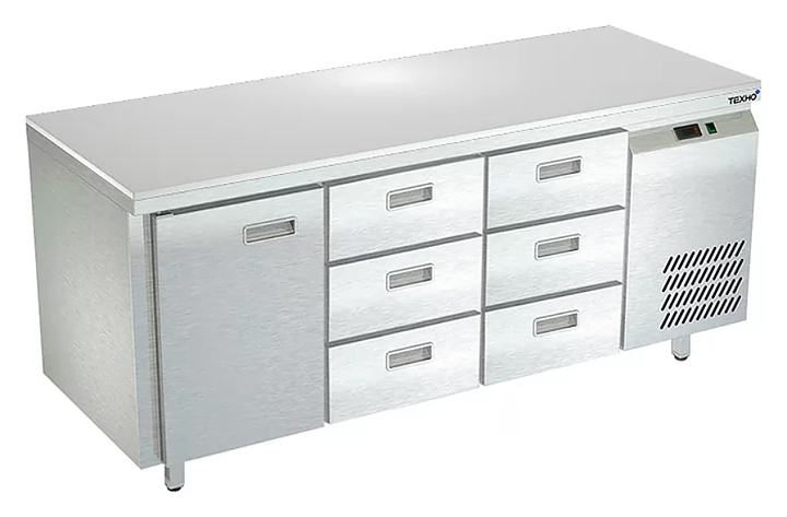 Морозильный стол Техно-ТТ СПБ/М-522/16-1806 предназначен для раскатки теста, обработки, заморозки и долговременного хранения продуктов, полуфабрикатов, напитков и мороженого на предприятиях общественного питания и торговли. Модель оснащена 1 секцией с дверью и регулируемой полкой-решеткой, 2 секциями с 6 ящиками, направляющими с доводчиками (Австрия), петлями-доводчиками (Польша) и круглыми ножками, регулируемыми по высоте на 50 мм (Италия). Корпус выполнен из нержавеющей стали AISI 430, задняя стенка и дно - из оцинкованной стали, столешница - из полипропилена.