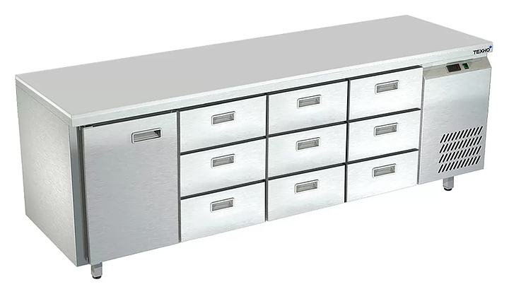 Морозильный стол Техно-ТТ СПБ/М-522/19-2206 предназначен для раскатки теста, обработки, заморозки и долговременного хранения продуктов, полуфабрикатов, напитков и мороженого на предприятиях общественного питания и торговли. Модель оснащена 1 секцией с дверью и регулируемой полкой-решеткой, 2 секциями с 9 ящиками, направляющими с доводчиками (Австрия), петлями-доводчиками (Польша) и круглыми ножками, регулируемыми по высоте на 50 мм (Италия). Корпус выполнен из нержавеющей стали AISI 430, задняя стенка и дно - из оцинкованной стали, столешница - из полипропилена.