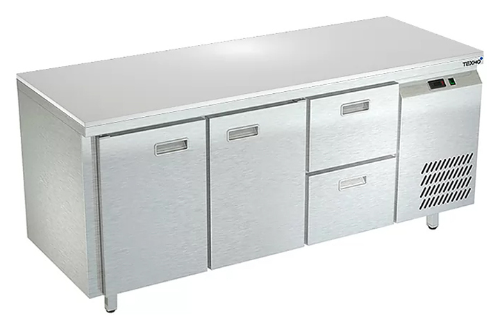Морозильный стол Техно-ТТ СПБ/М-522/22-1807 предназначен для раскатки теста, обработки, заморозки и долговременного хранения продуктов, полуфабрикатов, напитков и мороженого на предприятиях общественного питания и торговли. Модель оснащена 2 секциями с 2 дверьми и регулируемой полкой-решеткой, 1 секцией с 2 ящиками, направляющими с доводчиками (Австрия), петлями-доводчиками (Польша) и круглыми ножками, регулируемыми по высоте на 50 мм (Италия). Корпус выполнен из нержавеющей стали AISI 430, задняя стенка и дно - из оцинкованной стали, столешница - из полипропилена.