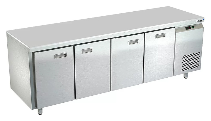 Морозильный стол Техно-ТТ СПБ/М-522/31-2207 предназначен для раскатки теста, обработки, заморозки и долговременного хранения продуктов, полуфабрикатов, напитков и мороженого на предприятиях общественного питания и торговли. Модель оснащена 3 секциями с 3 дверьми и регулируемой полкой-решеткой, 1 секцией с ящиком, направляющими с доводчиками (Австрия), петлями-доводчиками (Польша) и круглыми ножками, регулируемыми по высоте на 50 мм (Италия). Корпус выполнен из нержавеющей стали AISI 430, задняя стенка и дно - из оцинкованной стали, столешница - из полипропилена.