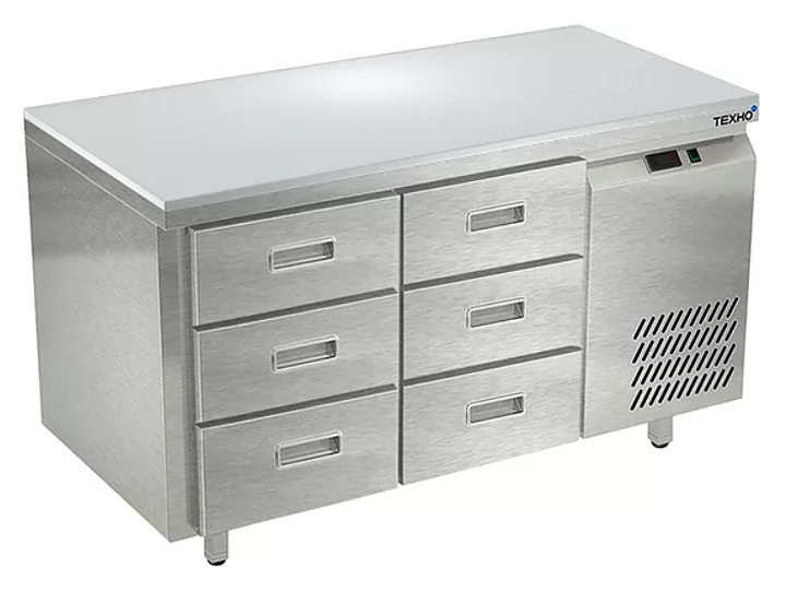 Морозильный стол Техно-ТТ СПБ/М-523/06-1307 предназначен для раскатки теста, обработки, заморозки и долговременного хранения продуктов, полуфабрикатов, напитков и мороженого на предприятиях общественного питания и торговли. Модель оснащена 2 секциями с 6 ящиками, направляющими с доводчиками (Австрия) и круглыми ножками, регулируемыми по высоте на 50 мм (Италия). Корпус выполнен из нержавеющей стали AISI 430, задняя стенка и дно - из оцинкованной стали, столешница - из полипропилена.