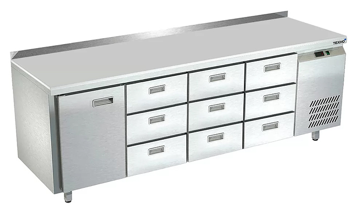 Морозильный стол Техно-ТТ СПБ/М-622/19-2207 предназначен для раскатки теста, обработки, заморозки и долговременного хранения продуктов, полуфабрикатов, напитков и мороженого на предприятиях общественного питания и торговли. Модель оснащена 1 секцией с дверью и регулируемой полкой-решеткой, 3 секциями с 9 ящиками, направляющими с доводчиками (Австрия), петлями-доводчиками (Польша), бортом и круглыми ножками, регулируемыми по высоте на 50 мм (Италия). Корпус выполнен из нержавеющей стали AISI 430, задняя стенка и дно - из оцинкованной стали, столешница - из полипропилена.