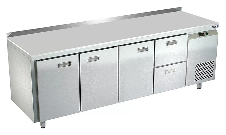 Морозильный стол Техно-ТТ СПБ/М-622/32-2207 предназначен для раскатки теста, обработки, заморозки и долговременного хранения продуктов, полуфабрикатов, напитков и мороженого на предприятиях общественного питания и торговли. Модель оснащена 3 секциями с 3 дверьми и регулируемой полкой-решеткой, 1 секцией с 2 ящиками, направляющими с доводчиками (Австрия), петлями-доводчиками (Польша), бортом и круглыми ножками, регулируемыми по высоте на 50 мм (Италия). Корпус выполнен из нержавеющей стали AISI 430, задняя стенка и дно - из оцинкованной стали, столешница - из полипропилена.