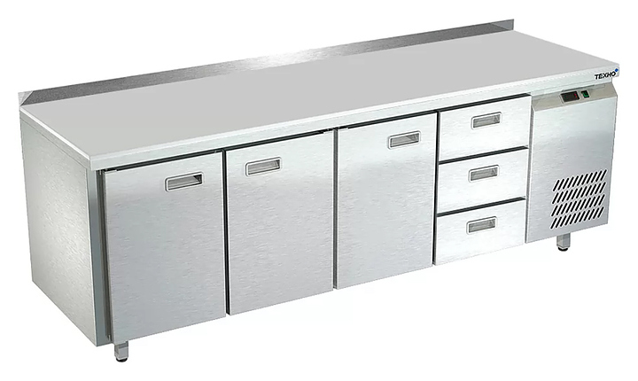 Морозильный стол Техно-ТТ СПБ/М-622/33-2206 предназначен для раскатки теста, обработки, заморозки и долговременного хранения продуктов, полуфабрикатов, напитков и мороженого на предприятиях общественного питания и торговли. Модель оснащена 3 секциями с 3 дверьми и регулируемой полкой-решеткой, 1 секцией с 3 ящиками, направляющими с доводчиками (Австрия), петлями-доводчиками (Польша), бортом и круглыми ножками, регулируемыми по высоте на 50 мм (Италия). Корпус выполнен из нержавеющей стали AISI 430, задняя стенка и дно - из оцинкованной стали, столешница - из полипропилена.