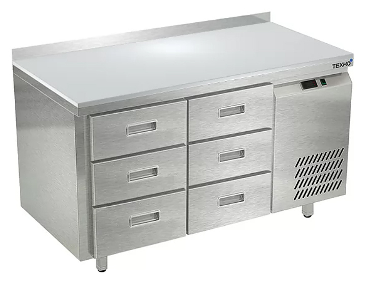 Морозильный стол Техно-ТТ СПБ/М-623/06-1306 предназначен для раскатки теста, обработки, заморозки и долговременного хранения продуктов, полуфабрикатов, напитков и мороженого на предприятиях общественного питания и торговли. Модель оснащена 2 секциями с 6 ящиками, направляющими с доводчиками (Австрия), бортом и круглыми ножками, регулируемыми по высоте на 50 мм (Италия). Корпус выполнен из нержавеющей стали AISI 430, задняя стенка и дно - из оцинкованной стали, столешница - из полипропилена.