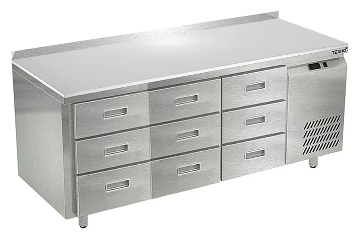 Морозильный стол Техно-ТТ СПБ/М-623/09-1806 предназначен для раскатки теста, обработки, заморозки и долговременного хранения продуктов, полуфабрикатов, напитков и мороженого на предприятиях общественного питания и торговли. Модель оснащена 3 секциями с 9 ящиками, направляющими с доводчиками (Австрия), бортом и круглыми ножками, регулируемыми по высоте на 50 мм (Италия). Корпус выполнен из нержавеющей стали AISI 430, задняя стенка и дно - из оцинкованной стали, столешница - из полипропилена.
