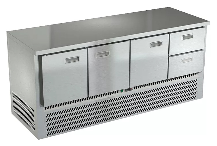 Морозильный стол Техно-ТТ СПН/М-122/32-1906 предназначен для раскатки теста, обработки, заморозки и долговременного хранения продуктов, полуфабрикатов, напитков и мороженого на предприятиях общественного питания и торговли. Модель оснащена компрессором, произведенным в Испании, 3 дверями с доводчиками (Польша), 3 регулируемыми по высоте полками-решетками, 2 гастронормированными ящиками, направляющими с доводчиками (Австрия) и регулируемыми опорными ножками. Корпус и столешница выполнены из нержавеющей стали AISI 430, задняя стенка и дно - из оцинкованной стали.